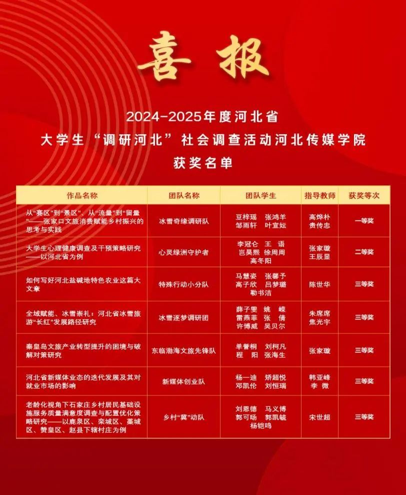近日,2024-2025年度河北省大学生“调研河北”社会调查活动获奖结果公布,我校在大赛中立项12项,获奖7项。《从“赛区”到“景区”、从“流量”到“留量”——张家口文旅消费赋能乡村振兴的思考与实践》课题荣获一等奖,《大学生心理健康调查及干预策略研究——以河北省为例》课题荣获二等奖,《如何写好河北盐碱地特色农业这篇大文章》等5项课题荣获三等奖。