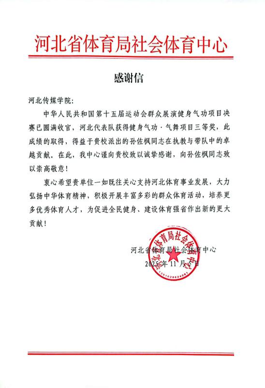 河北省体育局社会体育中心对孙佐枫老师的贡献给予了高度肯定,并专门发来感谢信。信中不仅向河北传媒学院致以诚挚的感谢,更向孙佐枫老师致以崇高敬意,高度赞扬她在本次全运会赛事中展现出的专业执教能力、高度的责任感与敬业精神。